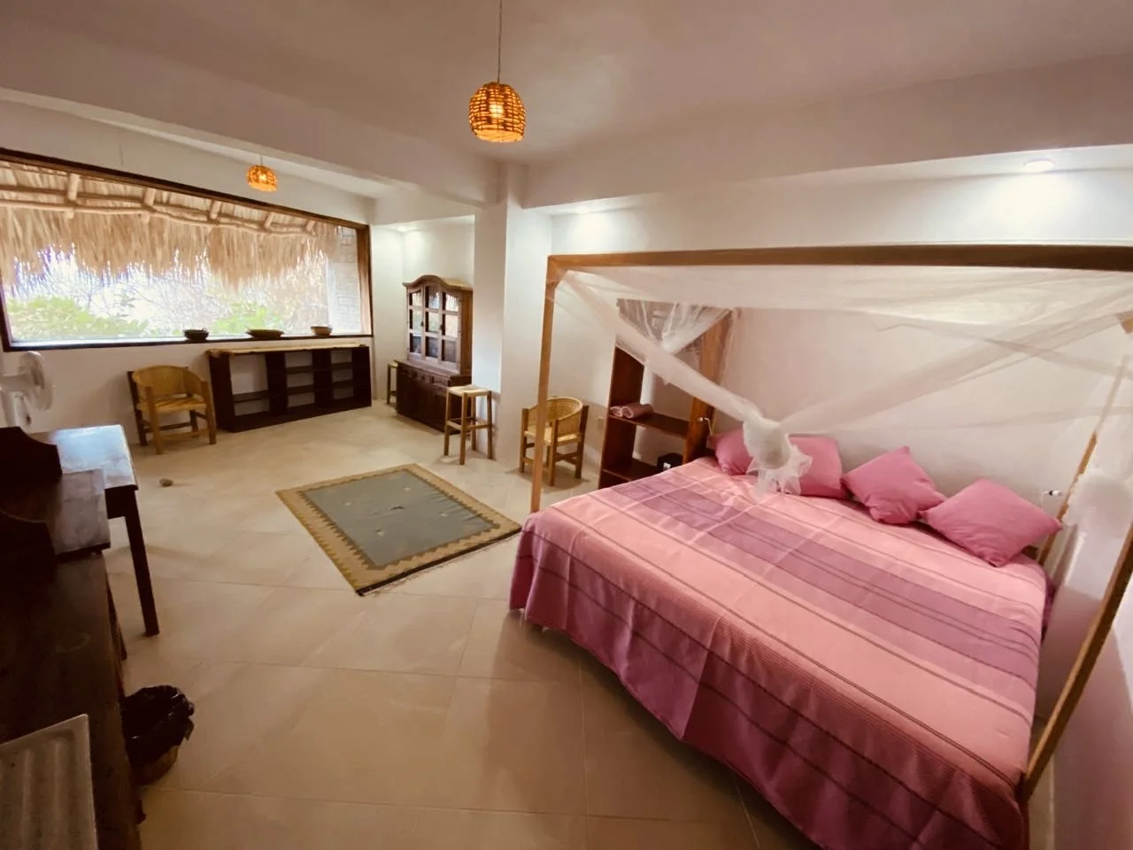 Cozy and quiet accommodation with two double beds. A bungalow with high palapa ceiling and large terrace with panoramic ocean view.
